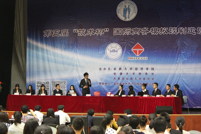 6月8日下午2點(diǎn),安徽大學(xué)磬苑校區大學(xué)生活動(dòng)中心迎來(lái)第五屆“技術(shù)杯”商務(wù)模擬談判邀請賽決賽環(huán)節。公司董事長(cháng)程峰、副總裁蔣逸、總會(huì )計師孫宏慶等公司領(lǐng)導,公司總裁辦主任李慧娟及人文部有關(guān)人員,安徽大學(xué)督導員、學(xué)生處、教務(wù)處、團委及經(jīng)濟學(xué)院等一眾領(lǐng)導,與安大學(xué)子們共同欣賞了一場(chǎng)精彩的“木材進(jìn)口”主題模擬談判。