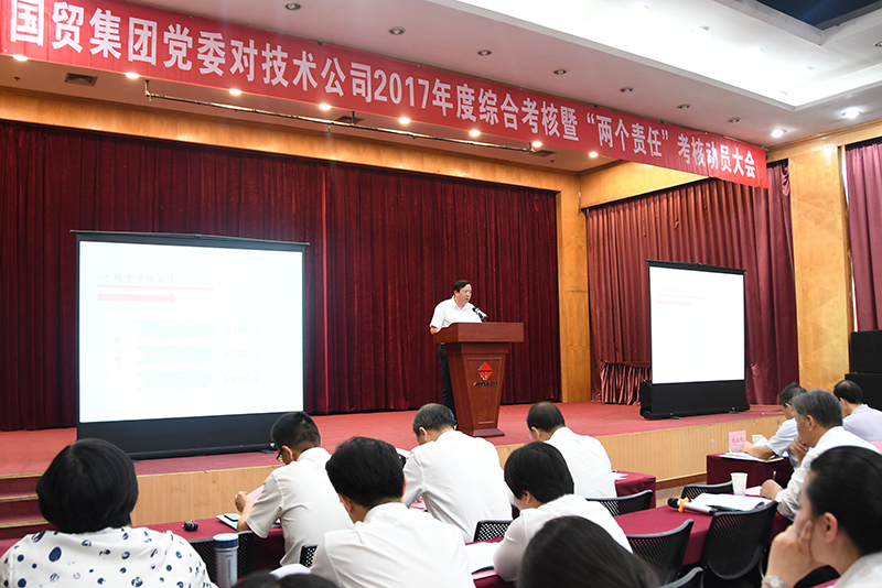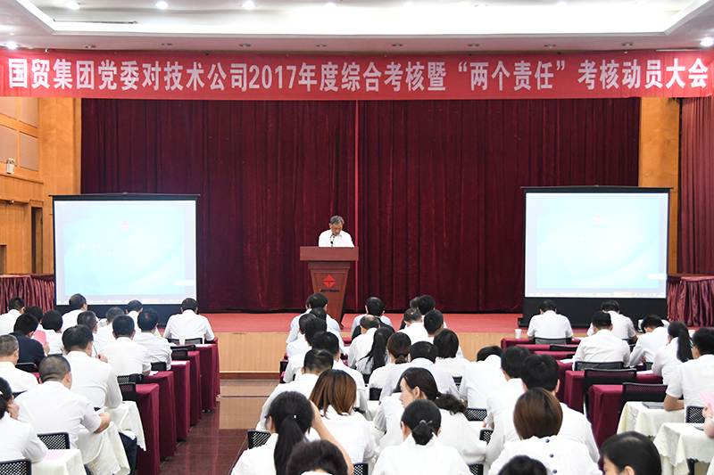 根據(jù)國貿(mào)集團(tuán)黨委的統(tǒng)一部署,2018年6月14日下午,國貿(mào)集團(tuán)黨委對技術(shù)公司2017年度綜合考核暨“兩個責(zé)任”考核動員大會在公司二樓多功能廳召開。公司領(lǐng)導(dǎo)班子成員,本部高級主管、高級業(yè)務(wù)經(jīng)理及以上人員,子公司主要負(fù)責(zé)人及“兩代會”代表共約152人參加了會議。國貿(mào)集團(tuán)黨委副書記、考核組副組長李明輝,總經(jīng)理助理劉業(yè)明,審計部總經(jīng)理王文生,考核組成員馬驊坤、晁圣林出席了此次會議。會議由公司黨委書記朱啟林主持。