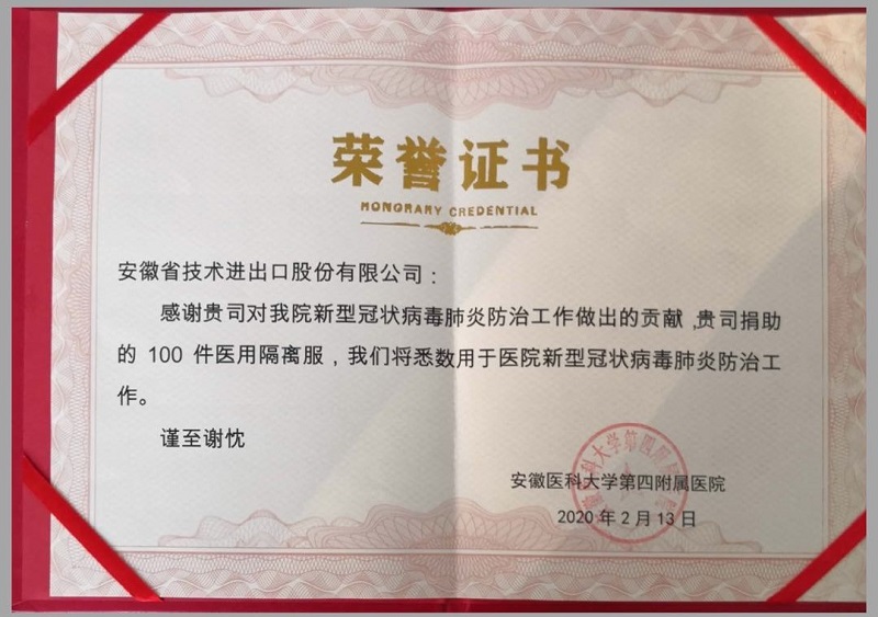 新冠肺炎疫情爆發(fā)以來,安徽醫(yī)科大學(xué)各直屬附屬醫(yī)院承擔(dān)著重要的防控任務(wù)。在聽聞安醫(yī)四附院急需各類防護物資的消息后,公司黨委書記、董事長程峰調(diào)動公司資源以最快的速度籌集了100套防護服送達醫(yī)院。四附院有關(guān)領(lǐng)導(dǎo)對公司能在目前疫情防護用品這么緊缺的情況下克服困難雪中送炭的善舉表示由衷的感謝。