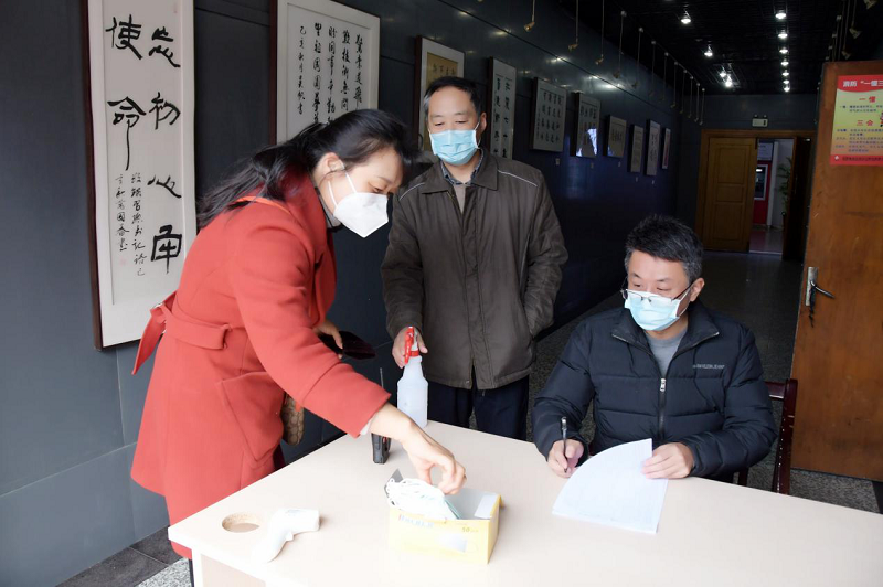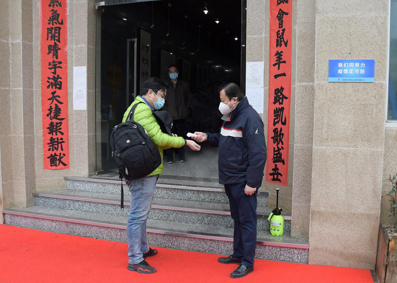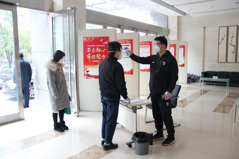 上午8點(diǎn)30分,公司疫情防控工作人員全部就位。公司大樓入口處,員工戴口罩間隔一米排隊(duì),接受體溫檢測,確認(rèn)無異常后對雙手、手機(jī)、鑰匙消毒,領(lǐng)取新口罩,方可進(jìn)入大樓。公司黨委書記、董事長程峰深入疫情防控一線,靠前指揮,檢查指導(dǎo)公司疫情防控工作。