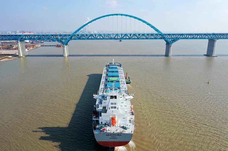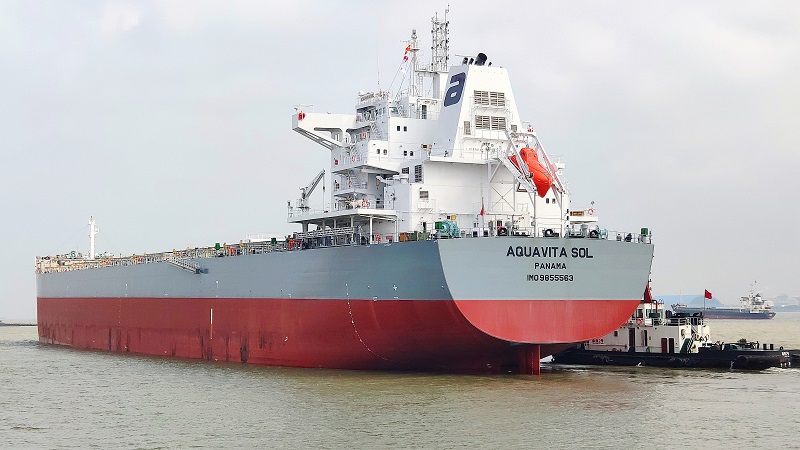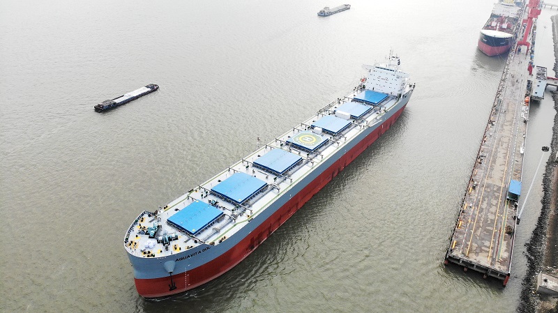 3月16日清晨,旭日初升,待工人們將碗口粗的纜繩解下,偌大的82000載重噸散貨船——“AQUAVITA SEA號”發(fā)出一聲長鳴,緩緩駛離岸邊,開啟它首次真正意義上的長途旅程,順利完成交付。