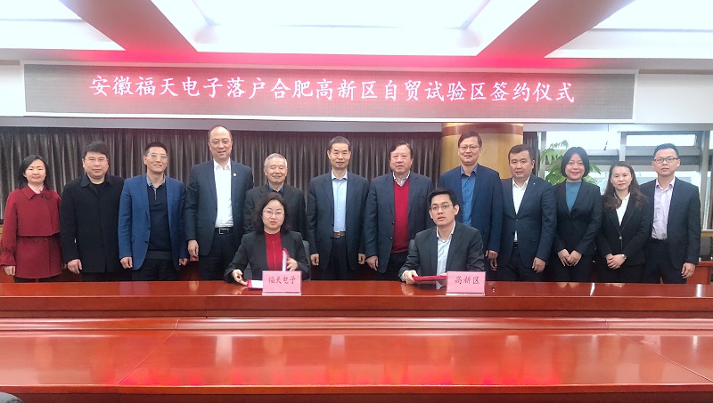 3月12日,公司和福嘉德公司合作成立的安徽福天電子落戶合肥高新區(qū)自貿(mào)試驗(yàn)區(qū)簽約儀式在公司舉行。合肥高新區(qū)黨工委書記、管委會(huì)主任宋道軍攜投資促進(jìn)局局長(zhǎng)徐斌、自貿(mào)試驗(yàn)區(qū)管理局副局長(zhǎng)苗寧寧,安徽福嘉德電子科技有限公司董事長(zhǎng)黃秀瑤,公司黨委書記、董事長(zhǎng)程峰,總裁莊斌兵,總會(huì)計(jì)師孫宏慶等相關(guān)人員,出席了本次簽約儀式。