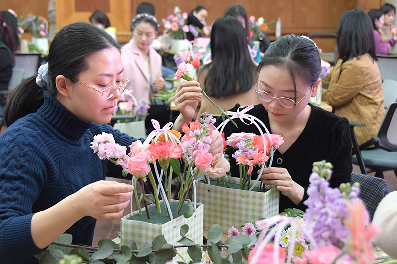 花藝DIY活動受到近百名女員工的青睞。公司工會邀請了專業(yè)花藝師現(xiàn)場指導(dǎo),詳細(xì)講解花朵的美好寓意、色彩搭配、花枝修剪以及藝術(shù)造型等方面知識,并現(xiàn)場進(jìn)行插花示范。大家聽完老師的講解,早已迫不及待,紛紛拿起面前的花材修枝剪葉、設(shè)計(jì)造型、精心構(gòu)思、巧妙搭配,充滿美好與希望的插花作品逐一呈現(xiàn)。大家捧著親手設(shè)計(jì)的花盒,笑容在臉上肆意綻放。