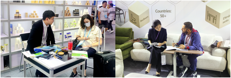 公司在原有主力產(chǎn)品基礎上,不斷增加產(chǎn)品樣式,提升產(chǎn)品系列化程度,憑借高顏值、高品質(zhì)吸引采購商駐足洽談。紙制品一如既往受歡迎,借助省內紙塑產(chǎn)業(yè)集聚優(yōu)勢,將紙杯、紙盤(pán)、紙袋等小產(chǎn)品做出大文章,現場(chǎng)已達30萬(wàn)美元意向訂單;家具產(chǎn)品種類(lèi)齊全,設計新穎,展位客商絡(luò )繹不絕,功能性沙發(fā)、椅子、桌柜產(chǎn)品詢(xún)問(wèn)量可觀(guān),已有客戶(hù)預定樣品,期待后續訂單的進(jìn)一步落實(shí)。