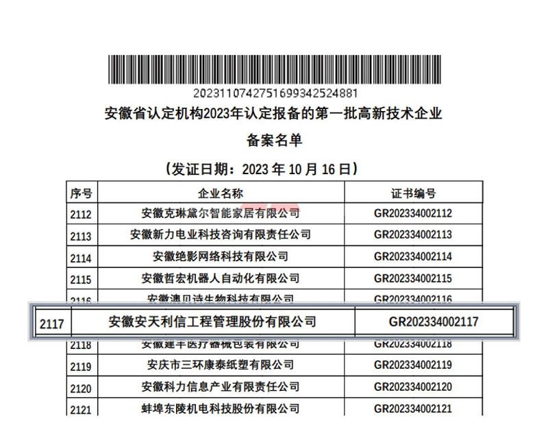 11月7日,安徽省認定機構2023年認定報備的第一批高新技術(shù)企業(yè)備案名單新鮮出爐,安天利信公司榮列其中。