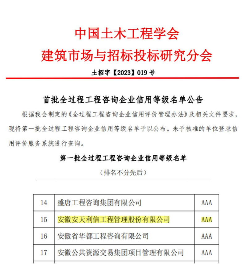 近日,中國土木工程學(xué)會(huì )建筑市場(chǎng)與招標投標研究分會(huì )公布了首批全過(guò)程工程咨詢(xún)企業(yè)信用等級評價(jià)結果,安天利信公司榮獲AAA等級。