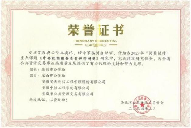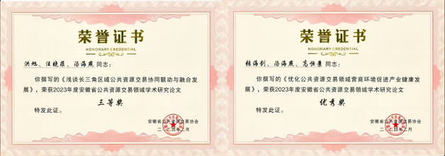 產(chǎn)學(xué)結合,將實(shí)踐轉為理論智慧。在安徽公共資源交易協(xié)會(huì )的學(xué)術(shù)研究活動(dòng)中,安天利信參與的《中介機構服務(wù)質(zhì)量評價(jià)研究》在2023年“揭榜掛帥”優(yōu)秀課題組排名第一;《淺談長(cháng)三角區域公共資源交易協(xié)同聯(lián)動(dòng)與融合發(fā)展》等兩篇學(xué)術(shù)研究成果分別獲得論文三等獎和優(yōu)秀獎,并被進(jìn)一步報送至安徽省社科聯(lián)參加評選。